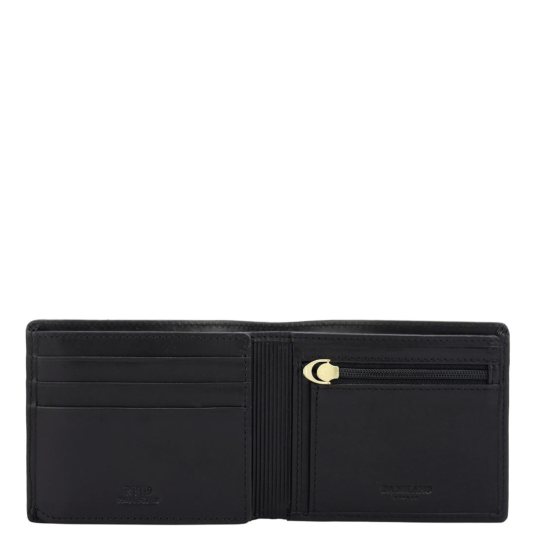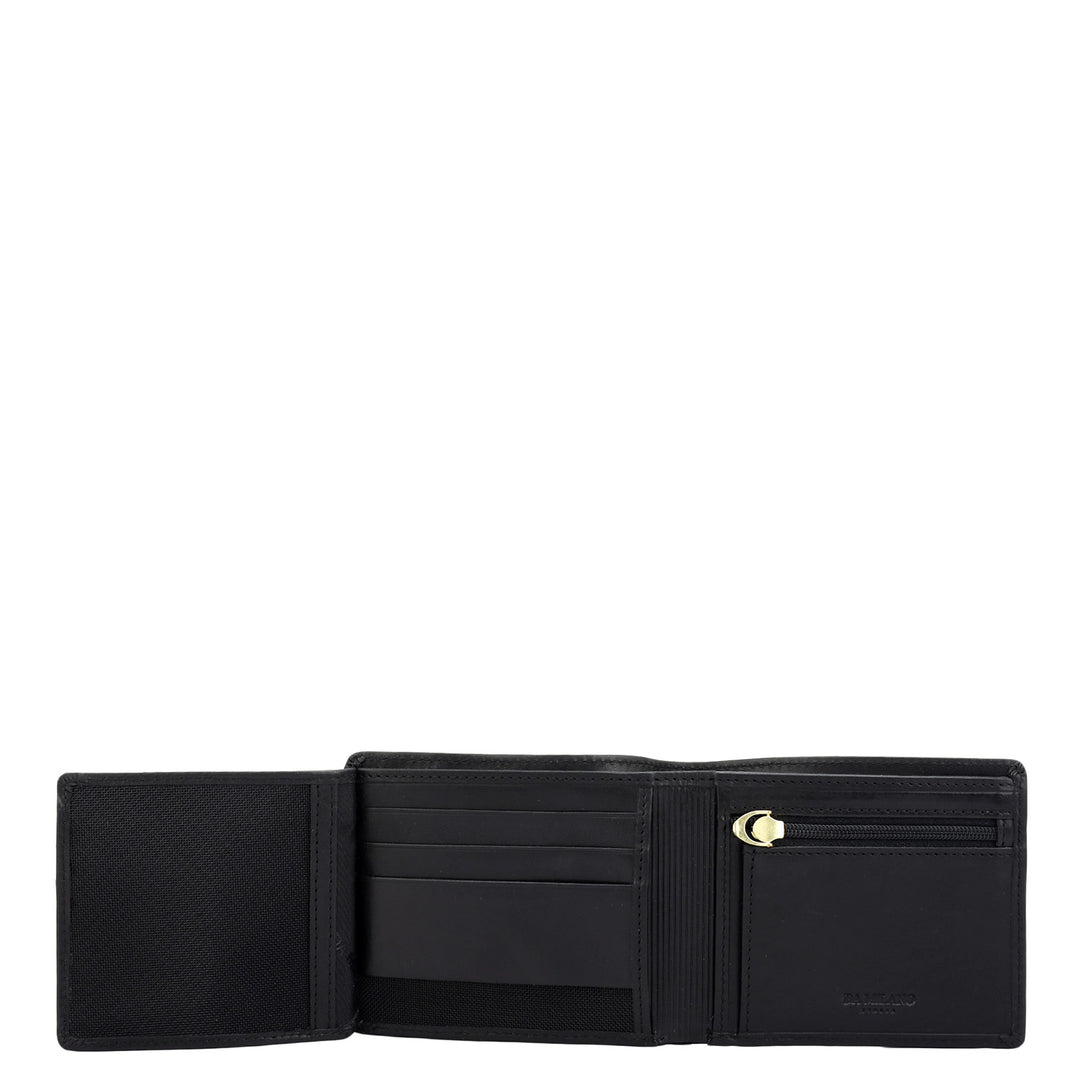 Crafted from textured leather, Da Milano men's bifold wallet offers a compact yet stylish design. Featuring easy-to-organize compartments, card slots, and pockets, it combines practicality with elegance. Subtle branding on the front enhances its refined appearance.